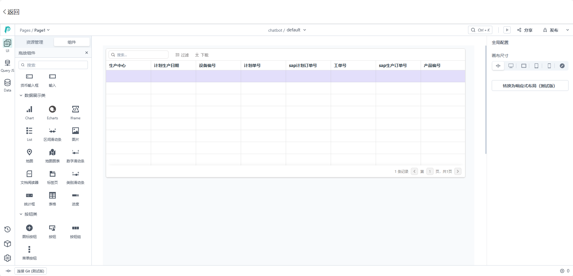 在卡片应用选择想要生成组件呈现样式,例,生成轮播表;点击“组件”-->选择“拖动组件”-->选择“大屏/可视化”-->选择“轮播表”,拖动到“PagePlug”应用页面,能自由调整轮播表的大小、颜色等。接着选择表头,对表头数据进行修改。修改完后,即可点击“发布”。